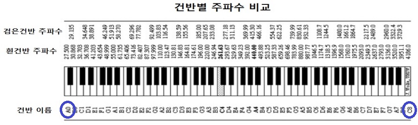 아래 피아노 건반 그림에서 보시듯이 모든 건반에는 A0에서 C8까지 고유의 이름이 붙여져 있습니다. ‘도’를 의미하는 C가 1에서 8까지 있으니 피아노에는 7개의 옥타브가 있는 셈입니다. 옥타브라 함은 ‘도’에서 ‘도’까지의 간격을 말하는데 , 한 옥타브의 주파수를 비교해 보면, C1의 주파수는 32.703Hz, C2의 주파수는 65.406Hz, C3의 주파수는 130.81Hz로 정확히 2배씩 증가한다는 것을 알 수 있습니다.
